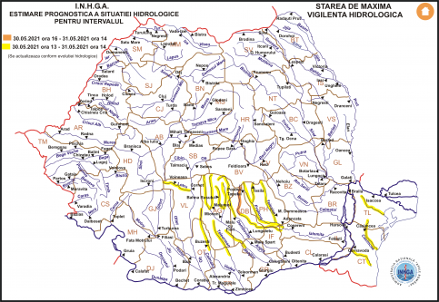 În intervalul 30.05.2021 ora 13:00 – 31.05.2021 ora 14:00 pe râurile din bazinele hidrografice: Olt – afluenţii aferenţi sectorului aval confluenţӑ cu râul Cibin – amonte Ac. Ioneşti (judeţele: Sibiu, Vâlcea şi Argeş), Vedea – bazin superior şi afluenţi bazin mijlociu şi inferior (judeţele: Argeş, Olt şi Teleorman), Argeş – bazin superior şi afluenţi bazin mijlociu şi inferior (judeţele: Argeş, Dâmboviţa, Giurgiu, Teleorman şi Ilfov), Ialomiţa – bazin amonte Ac. Dridu şi afluenţii aferenţi sectorului aval Ac. Dridu (judeţele: Dâmboviţa, Prahova, Ilfov şi Ialomiţa), râurile mici din Dobrogea (judeţele: Tulcea şi Constanţa).