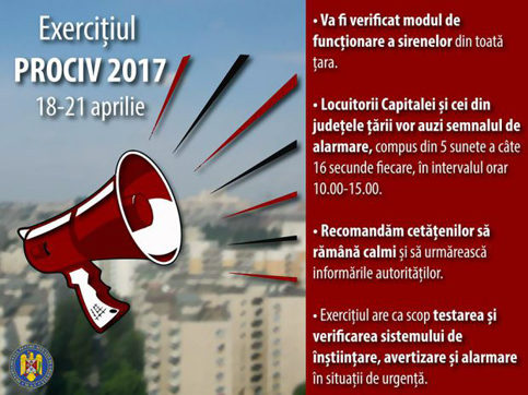 Miercuri, 19 aprilie, semnalele acustice vor fi pornite în Bucureşti, Argeş, Bacău, Botoşani, Braşov, Ilfov, Neamţ, Prahova, Suceava, Vaslui, Buzău, Dâmboviţa, Giurgiu şi Iaşi.