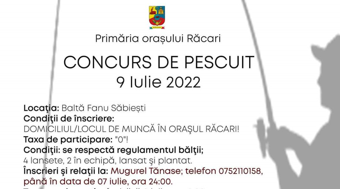 Primaria Răcari lansează invitație la un Concurs de pescuit, 9 iulie 2022, Balta Fanu Săbiești,partener și Articole Pescuit Răcari, condițiile de participare sunt să aveți domiciliu sau locul de muncă în orașul Răcari. Nu există taxă de participare.