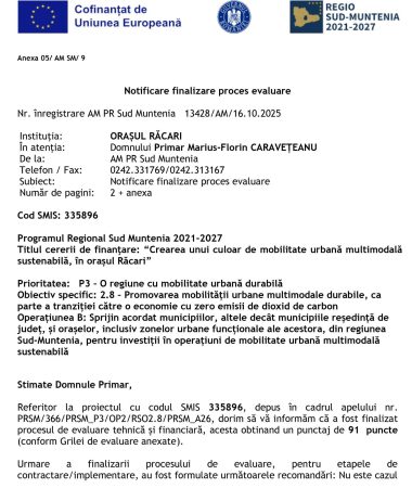 Primăria Orașului Răcari a fost notificată de către Autoritatea de Management pentru Programul Regional Sud Muntenia 2021-2027 privind finalizarea procesului de evaluare tehnică și financiară a proiectului „Crearea unui culoar de mobilitate urbană multimodală sustenabilă, în orașul Răcari” (Cod SMIS: 335896).
