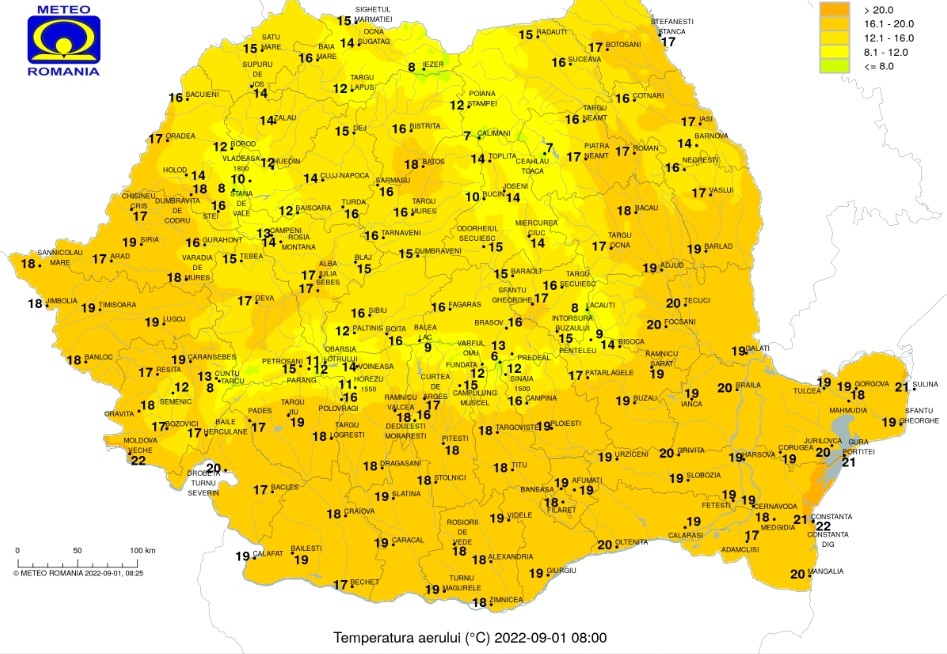 Temperaturile se vor apropia de cele normale pentru această lună a anului, iar vremea o să devină mai răcoroasă.Cerul se va menține variabil, cu unele înnorări pe timpul zilei la munte și pe arii restrânse în rest. Șansele de ploi torențiale sunt mai mari în sud-est, iar pe timpul nopții se vor extinde și în sud-vestul țării.