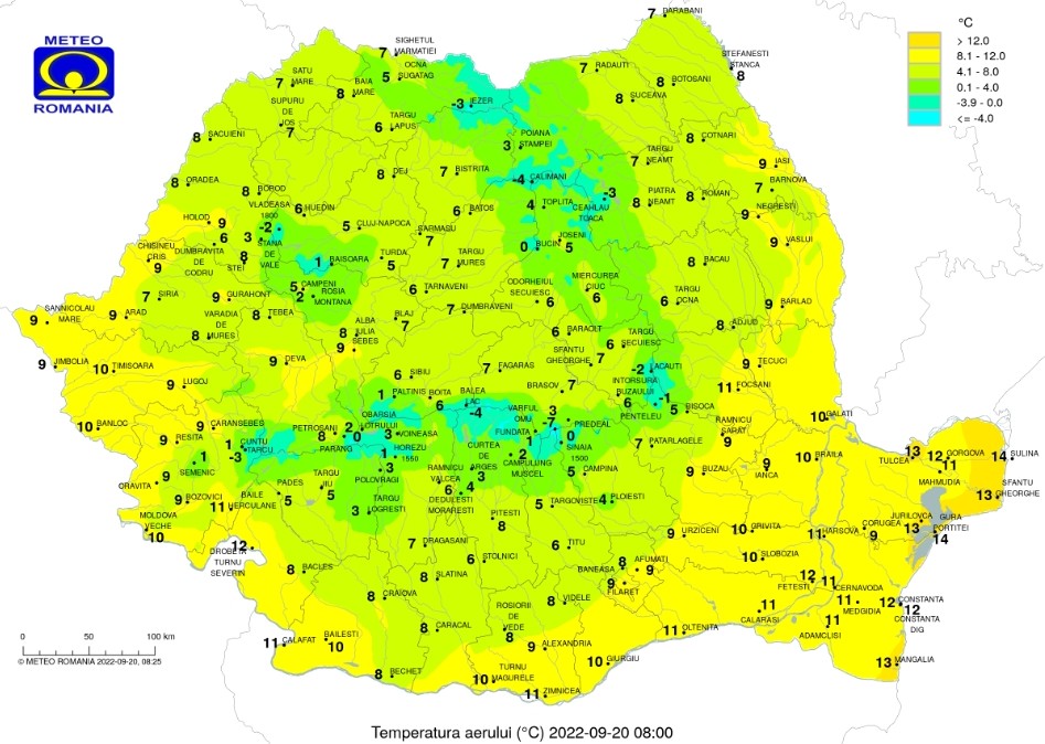 20 septembrie, temperaturile maxime se vor încadra între 10 și 22 de grade, iar cele minime vor fi cuprinse în general între 2 și 10 grade, valorile termice vor fi mai scăzute decât cele normale pentru această perioadă cu precădere în vest, centru și nord unde vremea se va menține deosebit de rece, iar în sud și sud-est va fi răcoroasă.