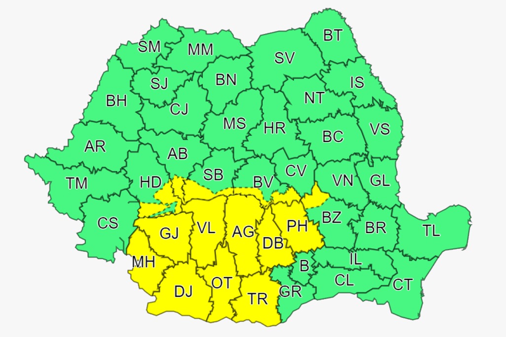 AVERTIZARE de ultima ORĂ , COD GALBEN de FURTUNI în tot județul Dâmbovița, 10 august, ora 10:00 – 11 august, ora 10:00, instabilitate atmosferică temporar accentuată.