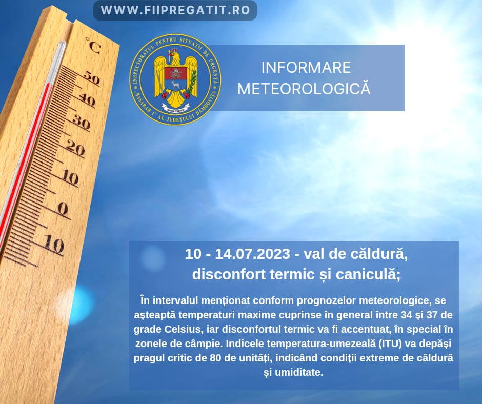 INFORMARE METEOROLOGICĂ de CANICULĂ , 10 iulie – 14 iulie, în intervalul menționat conform prognozelor meteorologice, se așteaptă temperaturi maxime cuprinse în general între 34 și 37 de grade Celsius, iar disconfortul termic va fi accentuat, în special în zonele de câmpie. Indicele temperatura-umezeală (ITU) va depăși pragul critic de 80 de unități, indicând condiții extreme de căldură și umiditate.