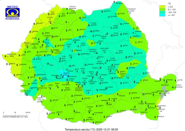 Temperaturile maxime vor fi în jur de 7°C, iar minimele nocturne vor coborî spre 0°C.