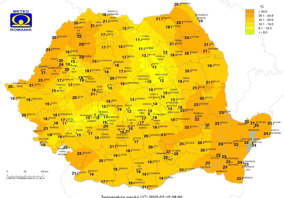 Vineri, 15 iulie 2022, temperaturile continuă să crească în cea mai mare parte a țării, iar canicula își spune cuvântul în sudul, sud-vestul și estul României, unde disconfortul termic va fi ridicat.