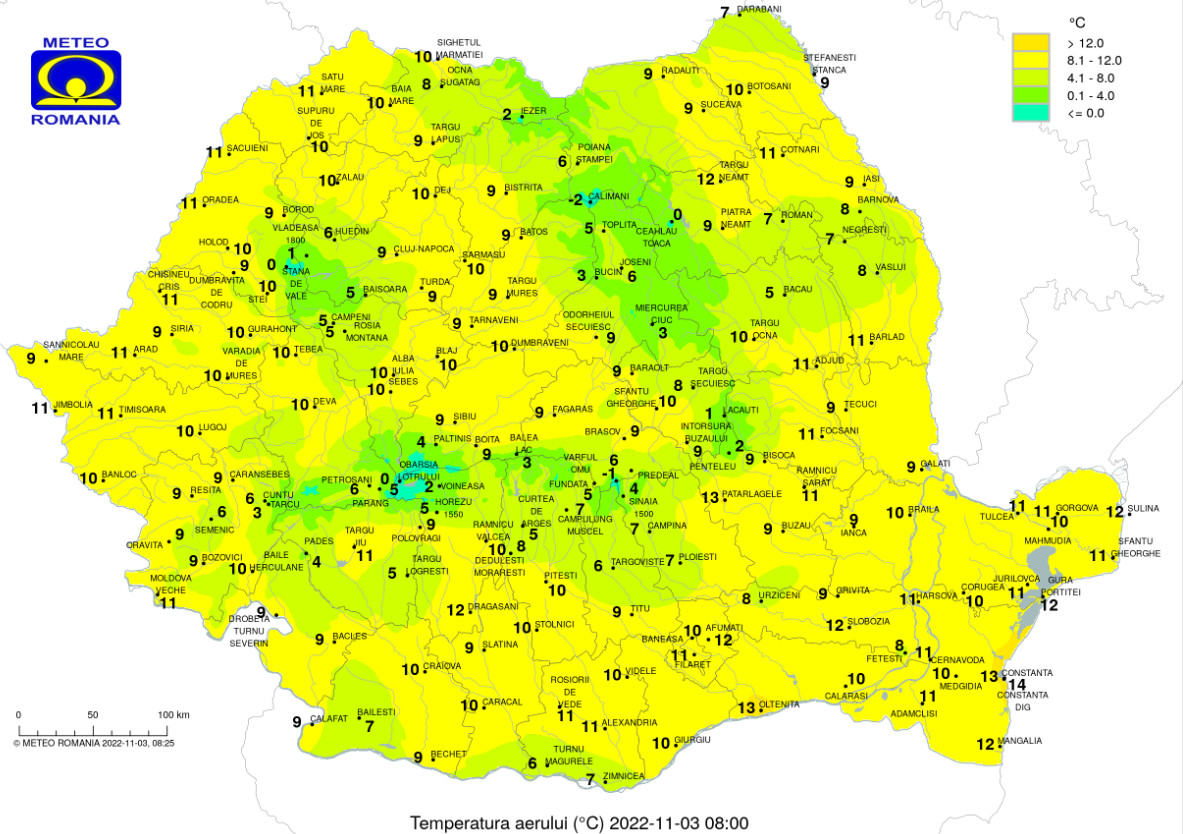 Vremea în țară, 3 noiembrie 2022, în regiunile intracarpatice nebulozitatea va fi în general persistentă și pe arii restrânse se vor semnala ploi slabe sau burniță, iar mai ales în prima parte a zilei și noaptea se va forma ceață.
