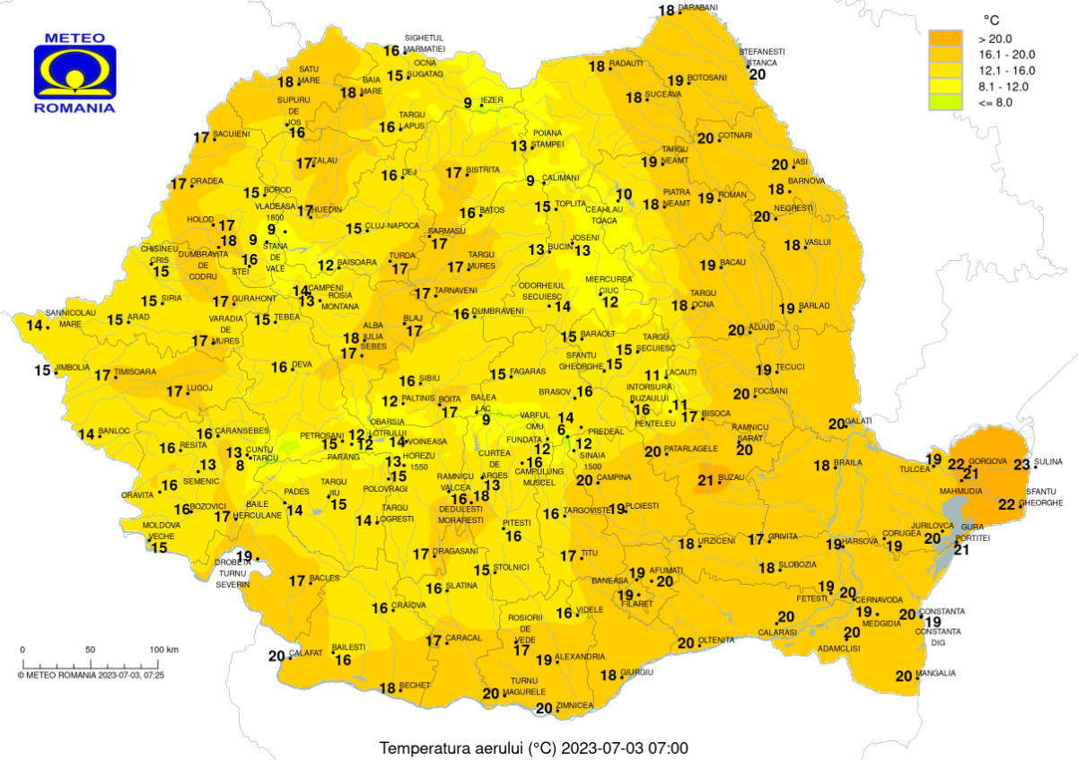 Vremea în toată țara pe 3 iulie 2023,instabilitatea atmosferică se va manifesta îndeosebi în jumătatea estică a țării, precum și în zonele montane.