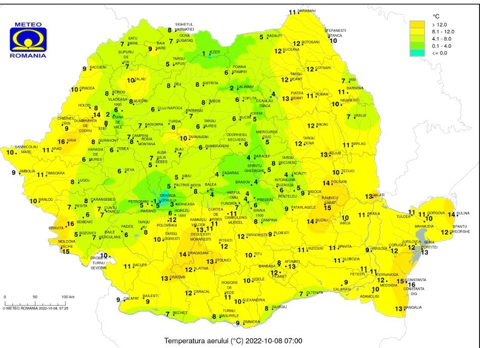 Vremea sâmbătă, 8 octombrie 2022,temperaturile maxime se vor încadra între 17 și 24 de grade, iar cele minime între 5 şi 13 grade, mai scăzute în depresiunile din estul Transilvaniei până spre 1…2 grade.