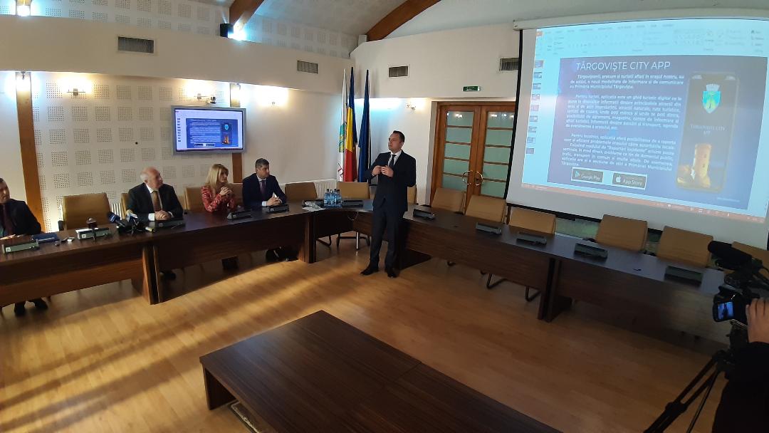 Sala de şedinţe a Consiliului Local Municipal Târgovişte a găzduit o conferinţă de presă în cadrul căreia primarul municipiului, Cristian Stan a lansat aplicația oficială Târgoviște City App.