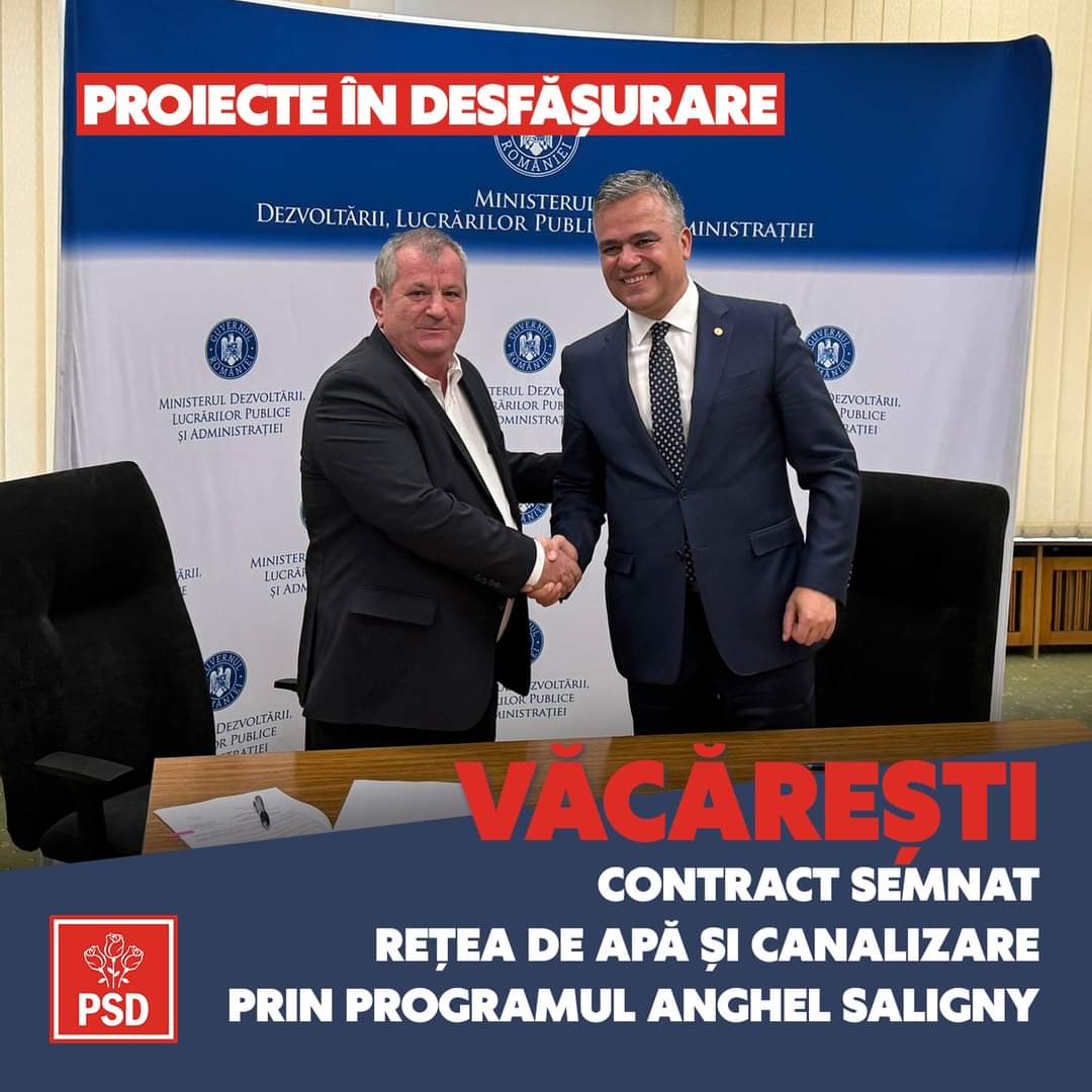 Primarul Romică Stoica a mers zilele trecute la Ministerul Dezvoltării, Lucrărilor Publice și Administrației și a semnat contractul de finanțare prin programul național „Anghel Saligny” pentru apă și canalizare.