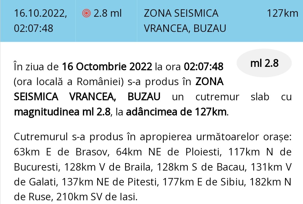 A fost cutremur in noaptea de 16 octombrie 2022, la ora 02:07:48 (ora locală a României), în zona seismică Vrancea, Buzău, un cutremur cu magnitudinea ml 2.8, la adâncimea de 127km.