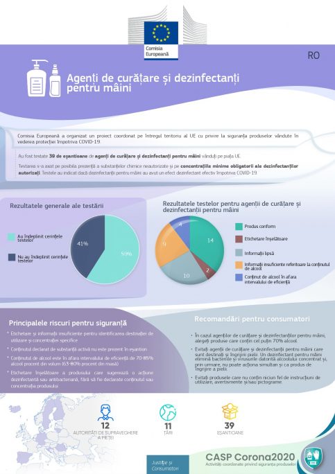 Acțiunea „CASP Corona 2020„ și-a propus să abordeze pericolele identificate într-un mod coordonat printr-o activitate de testare comună și să utilizeze rezultatele pentru o comunicare direcționată către consumatorii europeni, cu un accent special pe sfaturi pentru consumatorii care cumpără aceste tipuri de produse.