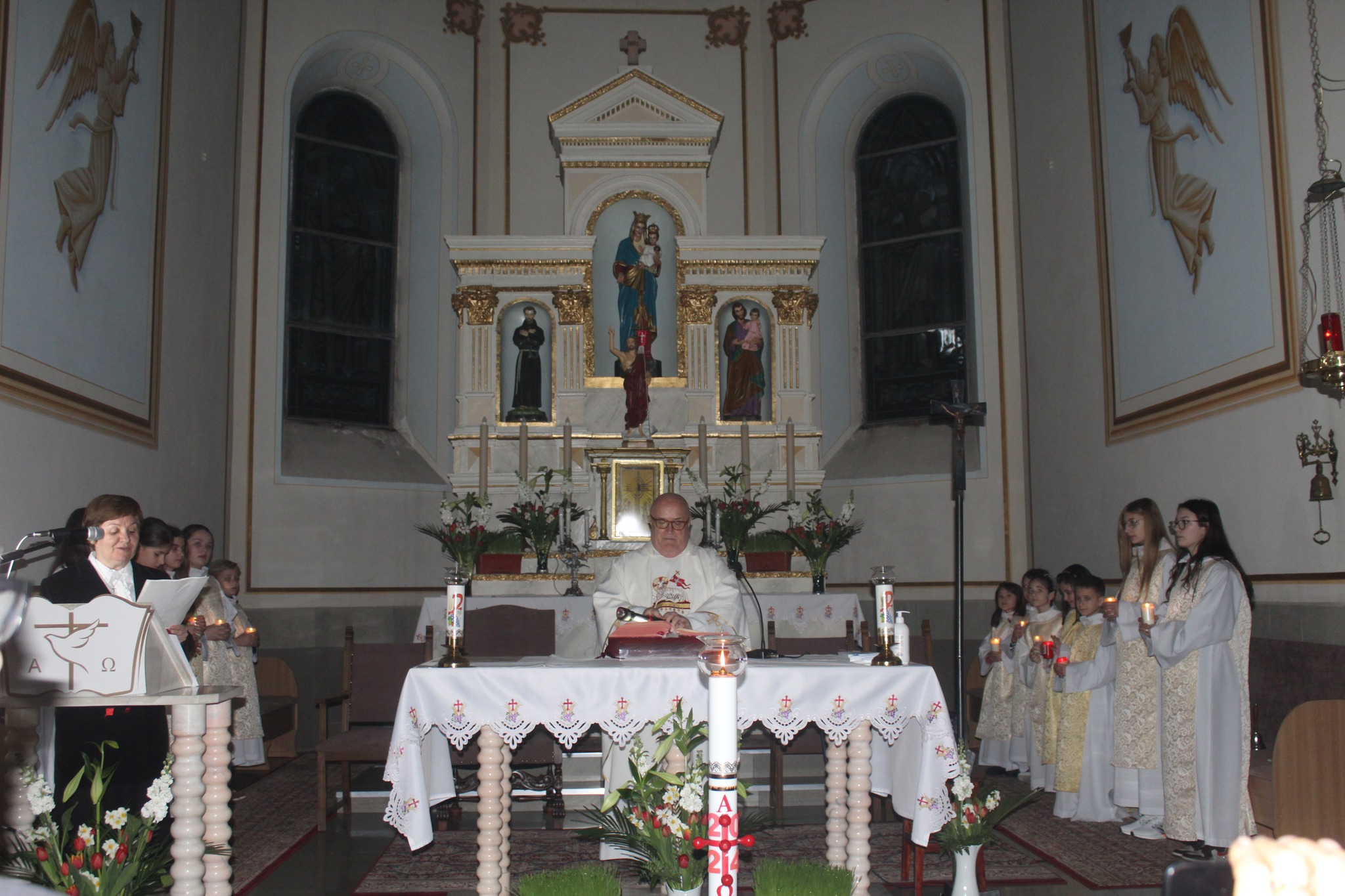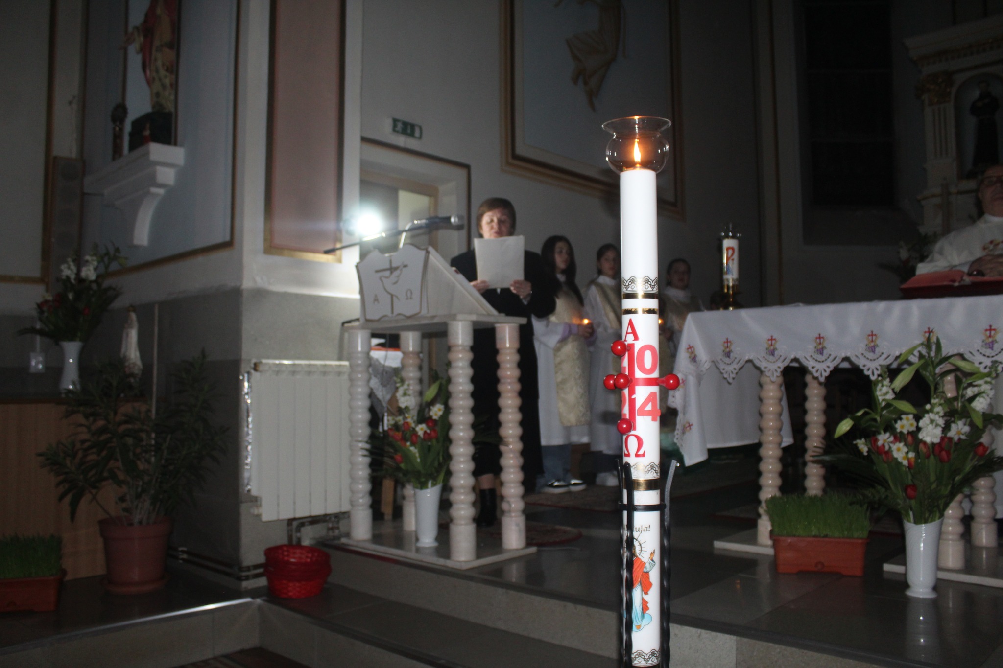 Liturghia zilei Sfintelor Paşti, din ziua de duminică, se celebrează cu mare solemnitate. La începutul Liturghiei, credincioşii sunt stropiţi cu apă binecuvântată în noaptea precedentă pentru a aminti de Botez. Lumânarea pascală, o lumânare mare, simbol al Învierii lui Hristos, este aşezată lângă altar.