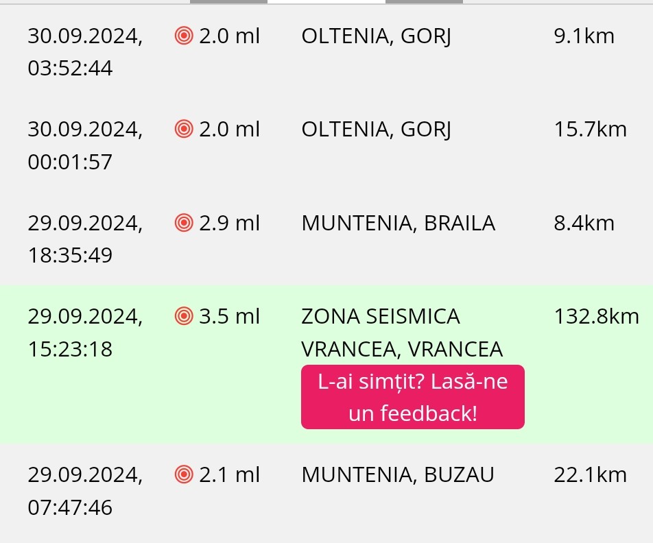 Al patrulea: În ziua de 30 Septembrie 2024 la ora 00:01:57 (ora locală a României) s-a produs în OLTENIA, GORJ un cutremur slab cu magnitudinea ml 2.0, la adâncimea de 15.7km.