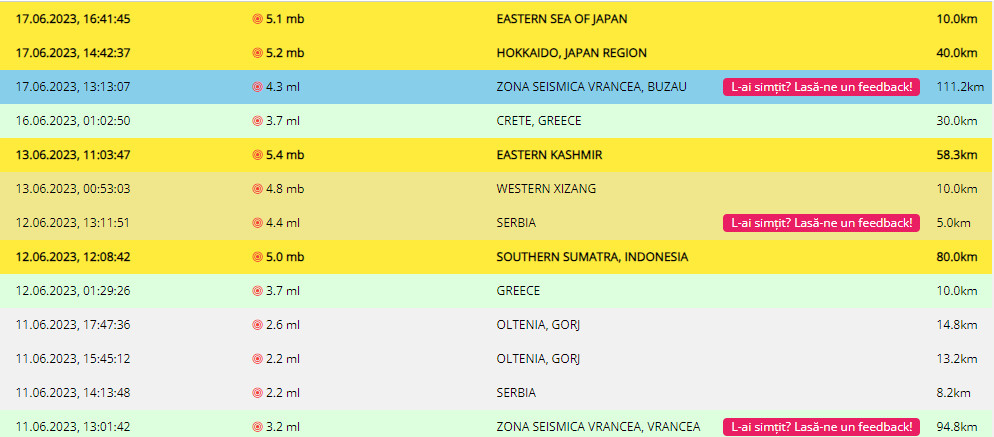 Cutremur cu magnitudinea ML 4.3, în ZONA SEISMICĂ VRANCEA, BUZĂU, în ziua de 17.06.2023, 13:13:07 (ora României), s-a produs la adâncimea de 111.2 km.