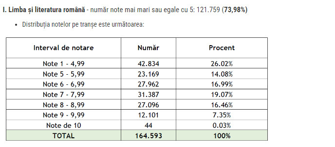 Limba și literatura română – număr note mai mari sau egale cu 5: 121.759 (73,98%)