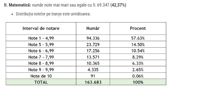 Dezastru privind rezultatele simulării Evaluare Națională pentru clasa a VIII-a, 57,63% dintre elevii care s-au prezentat la proba de matematică de la simularea Evaluării Naționale 2024, nu au obținut nota 5, adică aproape 95 de mii de elevi.