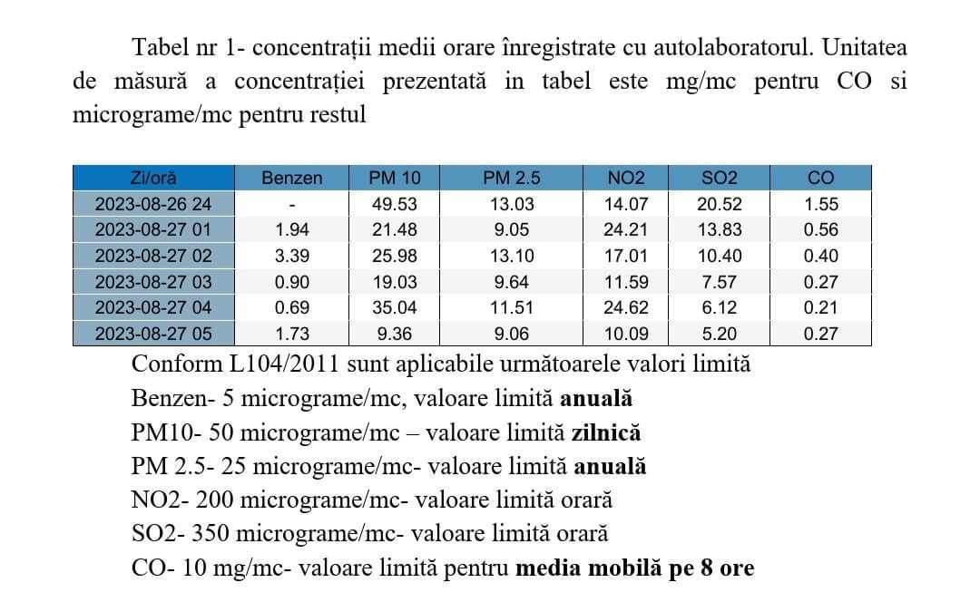 Puteți vedea evoluția concentrațiilor poluanților monitorizați pe parcursul celor șase ore, în tabelele următoare, care au fost anexate Raportului de Monitorizare.