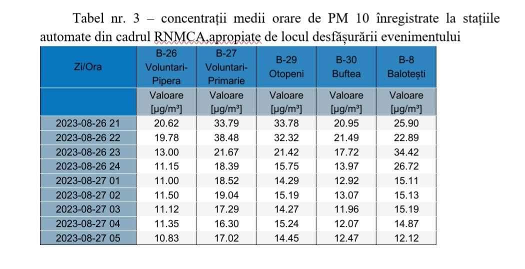 Datele de monitorizare sunt prezentate în anexă iar concluzia generală este că evenimentul nu a avut un impact semnificativ asupra calității aerului. Pentru poluanții care nu avem definite valori limită orare sau CMA pe 30 de minute, datele sunt prezentate orientativ întrucât evaluarea calității aerului nu se poate face pe perioade mult mai mici decît perioada de referință pentru care au fost definite valorile limită (zi sau an calendaristic). Spre ora 3.30-4.00 dimineața a avut loc o ușoară creștere a concentrațiilor de particule în suspensie și dioxid de azot, foarte probabil datorită stingerii incendiului, moment în care fumul a rămas la nivelul solului și nu s-a dispersat. Concentrațiile celorlalți poluanți monitorizați au păstrat valorile reduse, se mai arată în Raport.