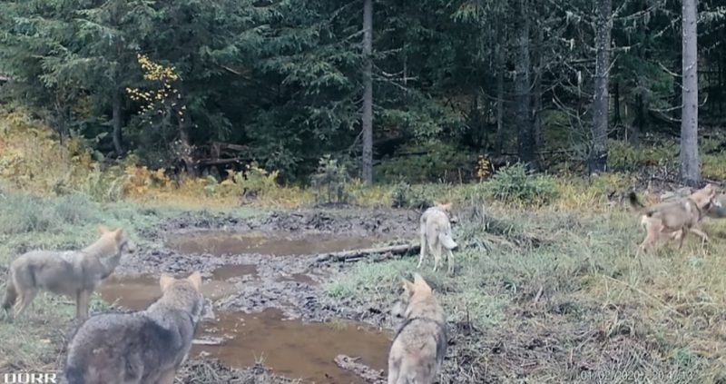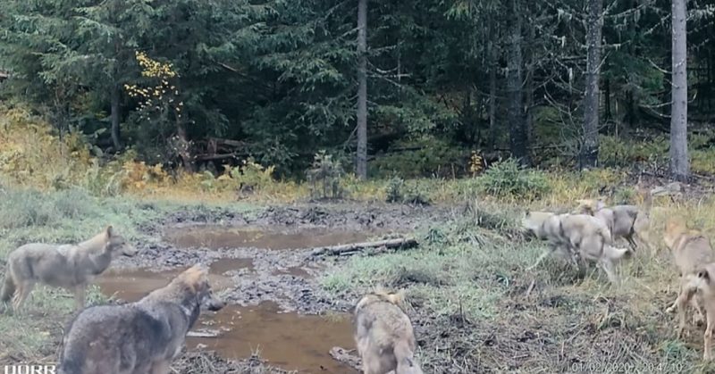 O haită de lupi a fost surprinsă în sălbăticie prin intermediul unei camere de monitorizare a faunei, instalată de către Ionel Moroșanu, angajat al Direcției Silvice Suceava.
