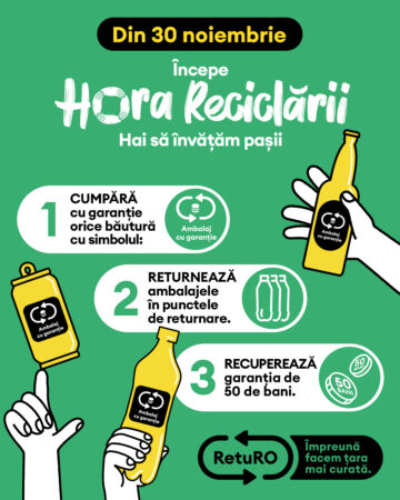 În mai puțin de o lună intrăm în Hora Reciclării! Începând cu 30 noiembrie toate etichetele de băuturi cu simbolul Ambalaj cu garanție pe etichetă, vor fi purtătoare de garanție. Astfel îți vei putea recupera garanția de 50 de bani.