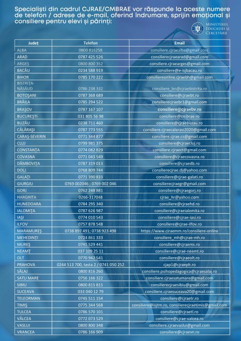 Specialiștii din cadrul Centrelor Județene de Resurse și Asistență Educațională/Centrul Municipiului București de Resurse și Asistență Educațională (CJRAE/CMBRAE) vor oferi zilnic, de luni până vineri, în intervalul orar 8:00-16:00, consiliere psihologică pentru elevi și părinți.