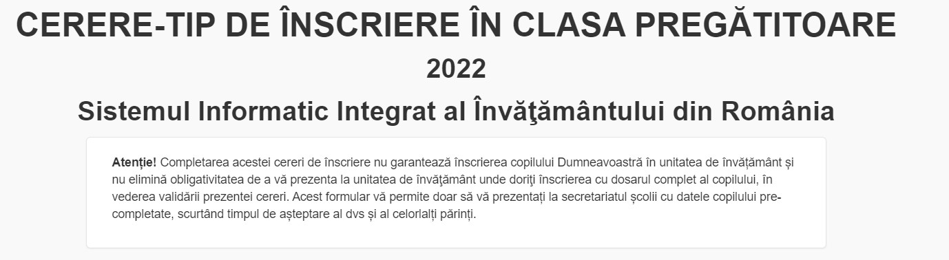 Atenție! Completarea cererii de înscriere nu garantează înscrierea copilului dumneavoastră în unitatea de învățământ și nu elimină obligativitatea de a vă prezenta la unitatea de învăţământ unde doriţi înscrierea cu dosarul complet al copilului, în vederea validării acesteia. Acest formular vă permite doar să vă prezentați la secretariatul școlii cu datele copilului precompletate, scurtând timpul de așteptare al tuturor.