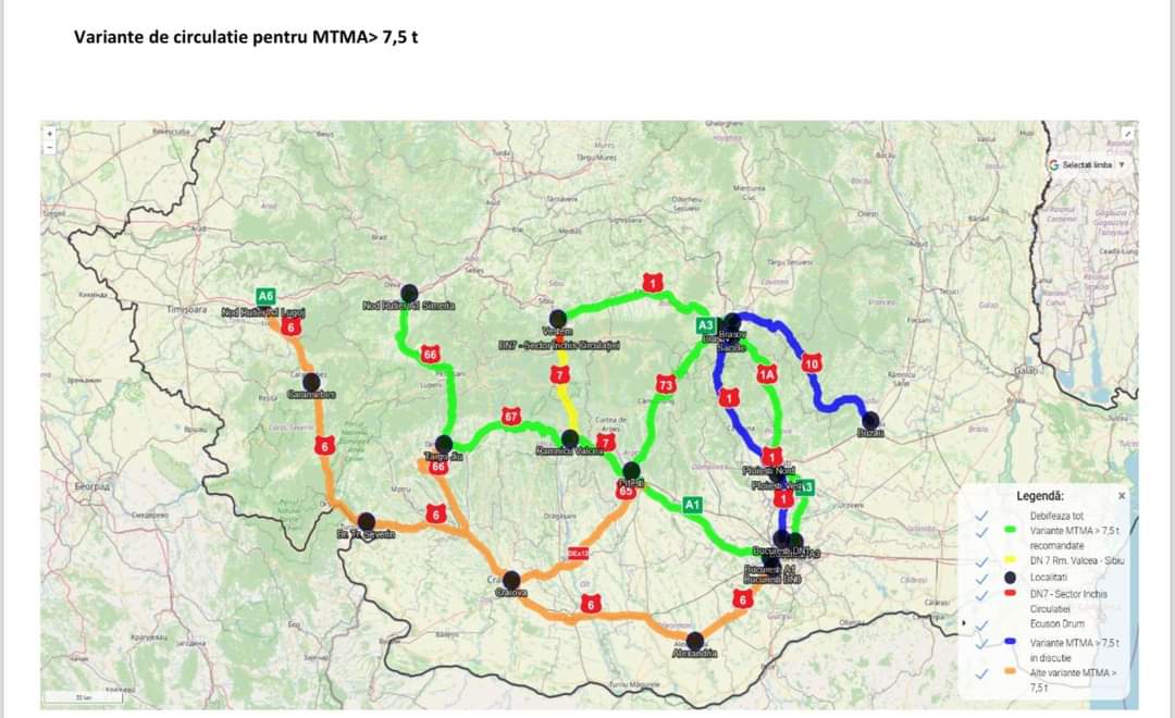Rugăm participanții la trafic să urmărească indicatoarele rutiere din această zonă, și să utilizeze și variantele de traseu propuse pe următoarele relații: