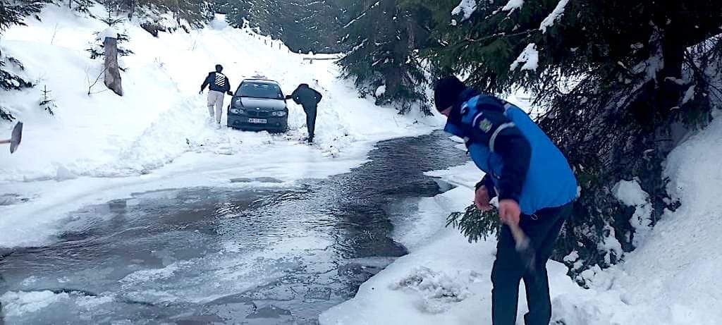 Este vorba de 3 turiști cazați în zonă, toți din județul Arad, care s-au aventurat cu mașina echipată necorespunzător, pe Valea Cobleș din localitatea Arieșeni.