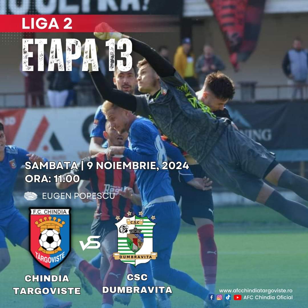 AFC Chindia Târgoviște întâlnește CSC Dumbrăvița în etapa a 13-a din Liga 2, 9 noiembrie, ora 11:00.Fanii echipei din Târgoviște sunt așteptați la stadion pentru a-și susține favoritii într-un duel care promite multă adrenalină!