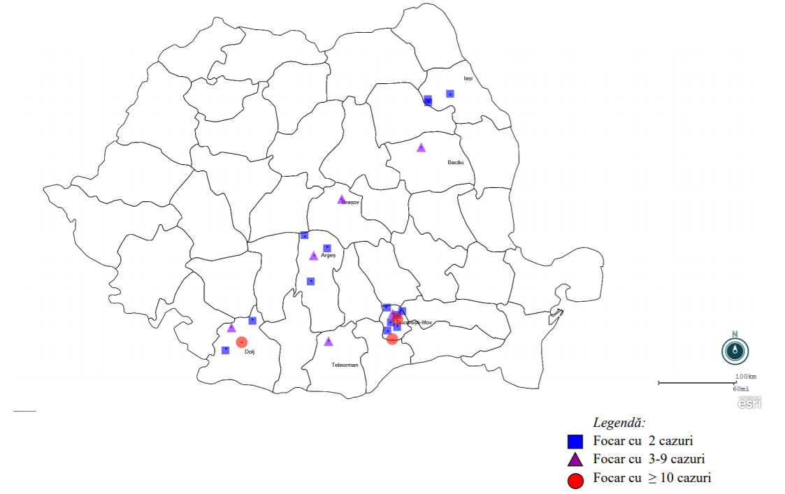 -54% (55 cazuri) se află în 23 focare, dintre care 17 familiale (27 cazuri) și 6 de colectivitate (28 cazuri), din 7 județe: Argeș (4), Bacău (1), Brașov (1), Dolj (4), Ilfov (4), Iași (3), Teleorman (1) și mun.București (5);