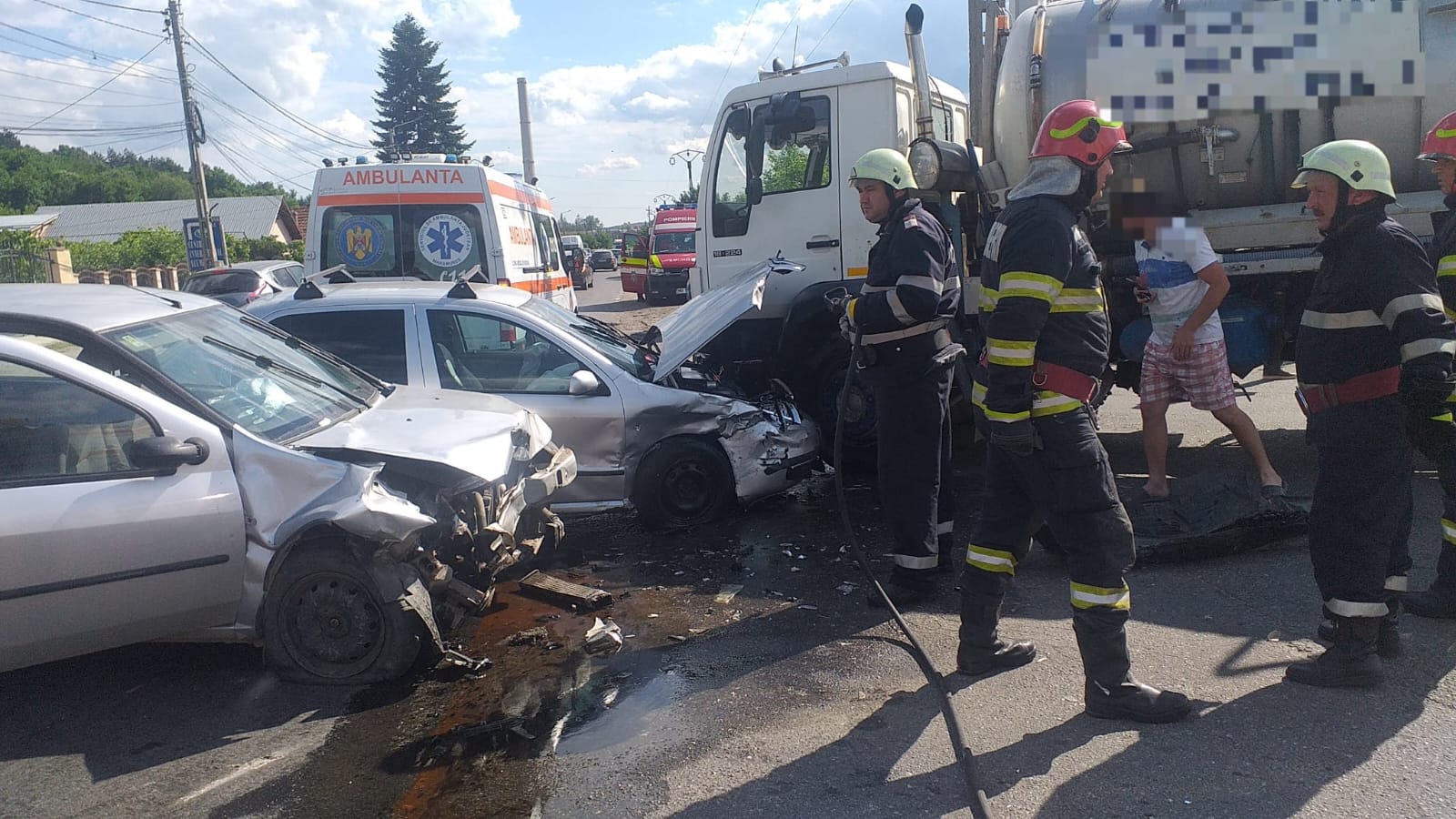 Accident grav, două autoturisme și o cisternă implicate, două persoane transportate la spital, evenimentul s -a produs chiar la intrarea în comuna Vulcana Pandele, la trecerea la nivel cu calea ferată.