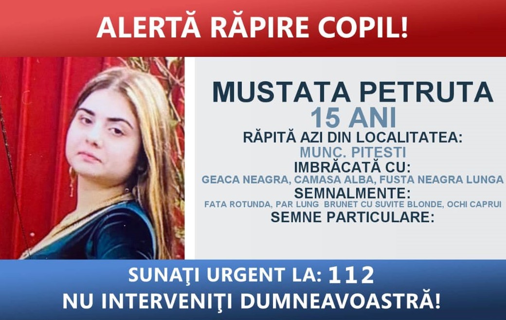 La data de 28 aprilie a.c., în jurul orei 11.00, Poliţia Municipiului Piteşti a fost sesizată cu privire la răpirea unei minore, de 15 ani, MUSTAŢĂ PETRUŢA, din Piteşti,judeţul Argeş.