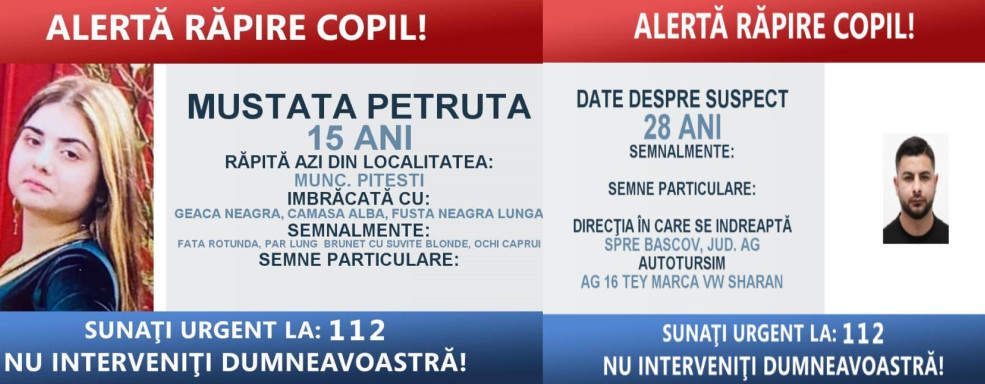 La data de 28 aprilie a.c., în jurul orei 11.00, Poliţia Municipiului Piteşti a fost sesizată cu privire la răpirea unei minore, de 15 ani, MUSTAŢĂ PETRUŢA, din Piteşti,judeţul Argeş.