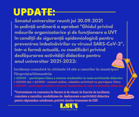 Deschiderea anului universitar 2021-2022 va avea loc în data de 1 octombrie 2021. Activitatea didactică aferentă tuturor programelor de studii ale Universității „Valahia” din Târgoviște se va desfășura în sistem fizic. În funcție de evoluția pandemiei și a dispozițiilor impuse de autorități, prezenta măsură poate suferi modificări. Eventualele schimbări privind desfășurarea activităților didactice vor fi anunțate pe site-ul universității, după caz, în timp util.