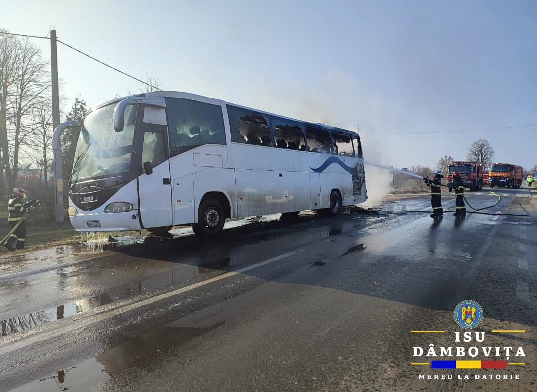 Autobuz cuprins de flăcări în Titu: Intervenție rapidă a pompierilor, fără victime