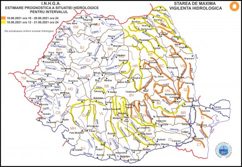 În intervalul 18.06.2021 ora 12:00 – 21.06.2021 ora 24:00 pe râurile din bazinele hidrografice: Târnava Mică – bazin superior şi afluenţi bazin mijlociu şi inferior, Târnava Mare – bazin superior şi afluenţi bazin mijlociu şi inferior (judeţele: Harghita, Mureş, Braşov, Sibiu şi Alba), Jiu – bazin superior amonte S.H. Sadu şi afluenţii aferenţi sectorului aval S.H. Sadu (judeţele: Hunedoara, Gorj, Mehedinţi şi Dolj), Olt – bazin amonte S.H. Sebeş Olt şi afluenţii aferenţi sectorului aval S.H. Sebeş Olt (judeţele: Harghita, Covasna, Braşov, Sibiu, Vâlcea, Argeş, Olt, Gorj şi Dolj), Vedea – bazin superior şi afluenţi bazin mijlociu şi inferior (judeţele: Olt, Argeş şi Teleorman), Argeş – bazin superior şi afluenţi bazin mijlociu şi inferior (judeţele: Argeş, Dâmboviţa, Giurgiu, Teleorman şi Ilfov), Ialomiţa – bazin superior şi afluenţi bazin mijlociu şi inferior (judeţele: Dâmboviţa, Prahova şi Ialomiţa), Călmăţui (judeţele: Buzău şi Brăila), Buzӑu (judeţele: Braşov, Covasna, Buzӑu, Prahova şi Brăila), Rm. Sărat (judeţele: Buzău şi Vrancea), Putna (judeţul Vrancea), Trotuş (judeţele: Harghita, Covasna, Neamţ, Bacău şi Vrancea), Bistriţa (judeţele: Suceava, Harghita, Neamţ şi Bacău), Moldova (judeţele: Suceava şi Neamţ), Suceava (judeţul Suceava), Bârlad (judeţele: Neamţ, Iaşi, Vaslui, Bacău, Vrancea şi Galaţi), Siret – afluenţii mici aferenţi sectorului aval confluenţă cu râul Suceava (judeţele: Suceava, Botoşani, Iaşi, Neamţ, Bacău, Vrancea şi Galaţi), Prut – afluenţii aferenţi sectorului aval S.H. Oroftiana (judeţele: Botoşani, Iaşi, Vaslui şi Galaţi) şi râurile din Dobrogea (judeţele: Constanţa şi Tulcea).