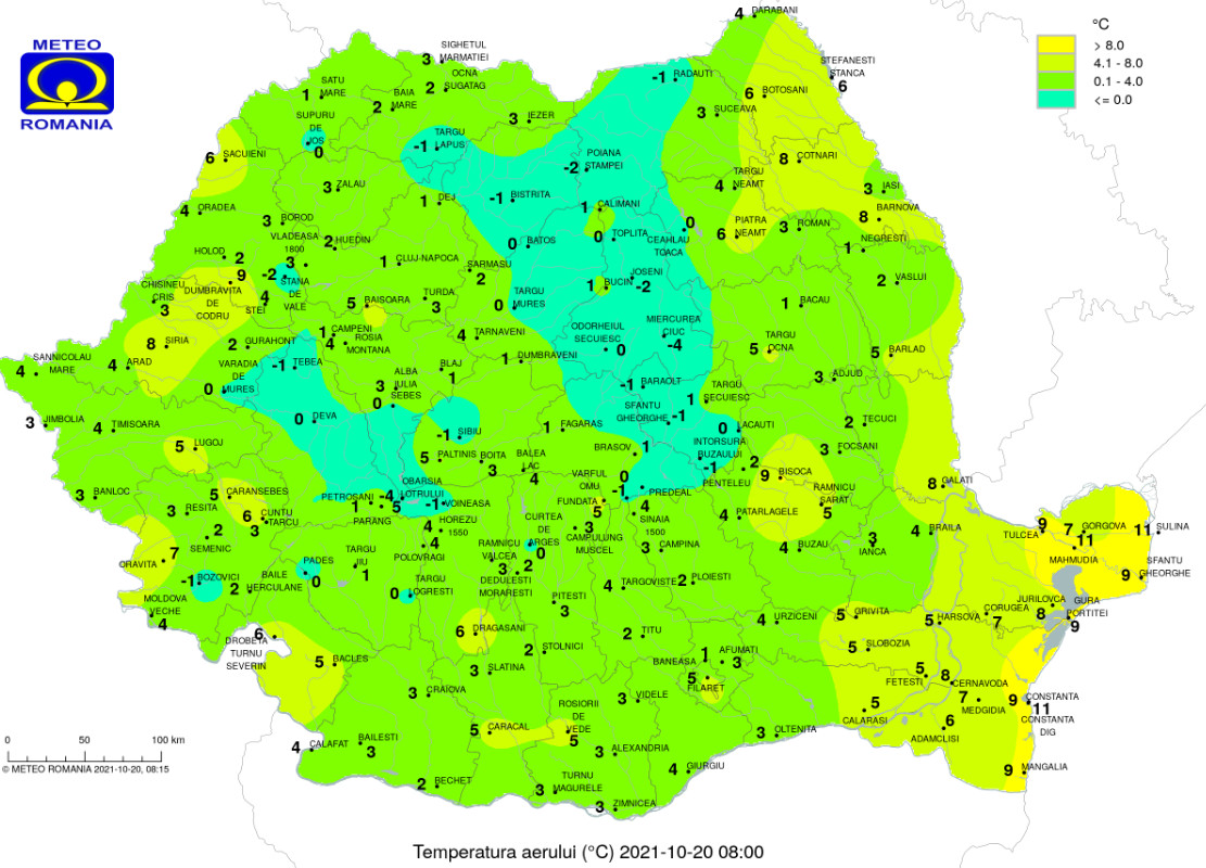 temperaturile minime vor fi în medie de 5…6 grade, cu valori mai ridicate în 23 octombrie, când se vor atinge 8…9 grade, dar și mai scăzute la începutul săptămânii viitoare, la o medieregională de 2…3 grade.