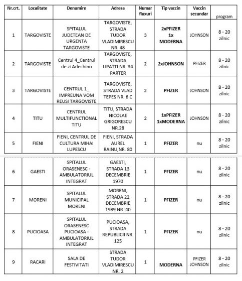 DSP Dâmbovița informează cetățenii despre centrele de vaccinare, active la nivelul județului, începând de luni 25.10.2021.