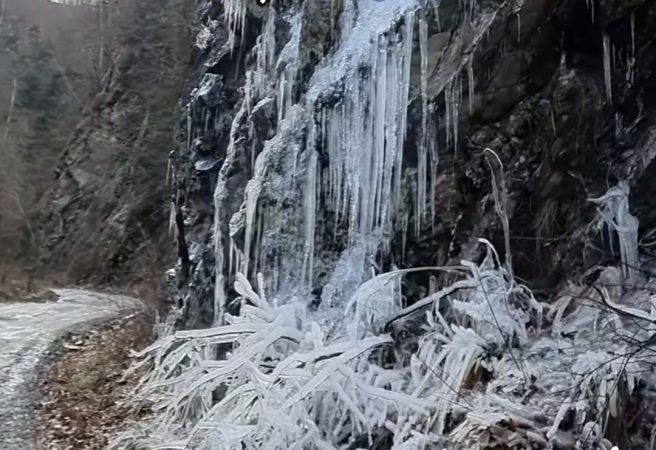 Formațiunile de gheață, sculptate de frig și apă, transformă poteca într-un adevărat tablou de iarnă, care atrage privirile turiștilor și iubitorilor de natură.