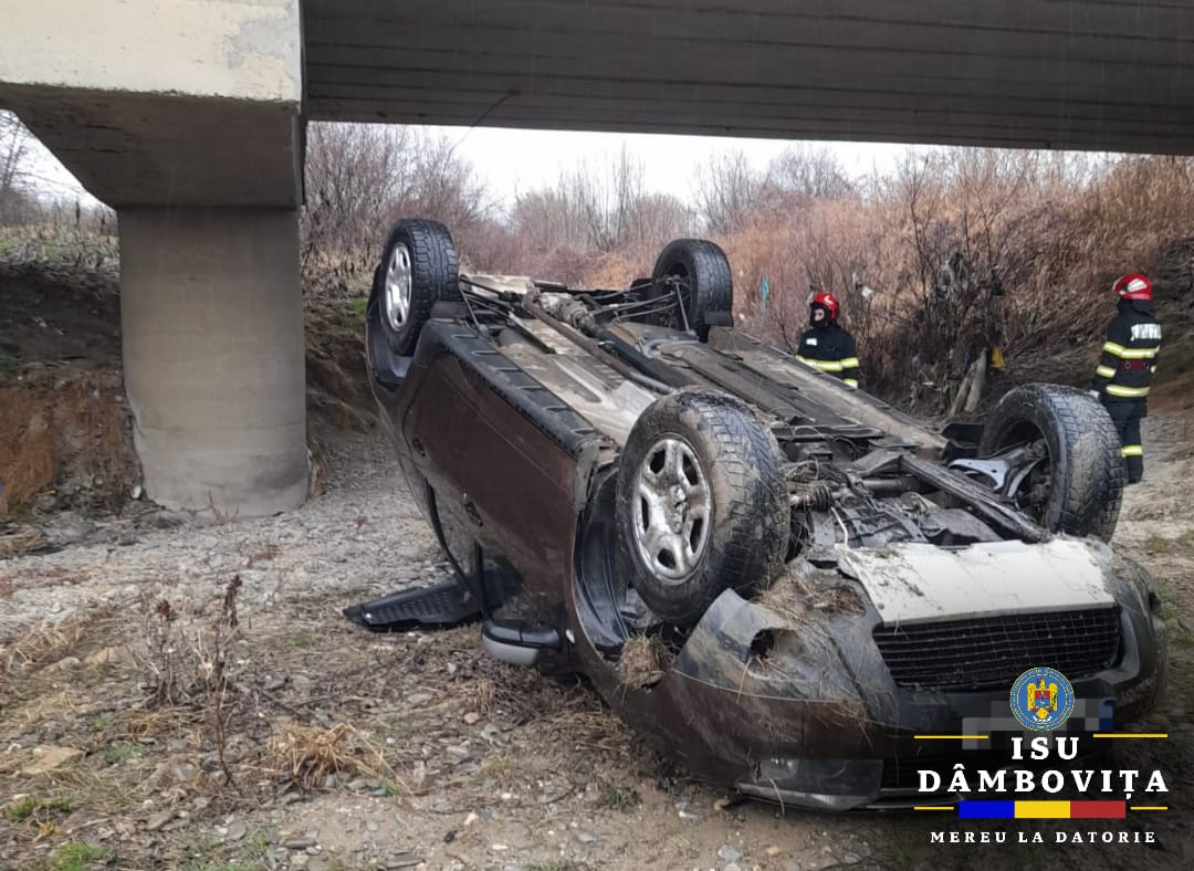 S-a răsturnat cu mașina de pe pod în comuna I.L. Caragiale, Detașamentul de Pompieri Moreni a intervenit cu o autospecială de stingere cu modul de descarcerare și un echipaj SMURD.