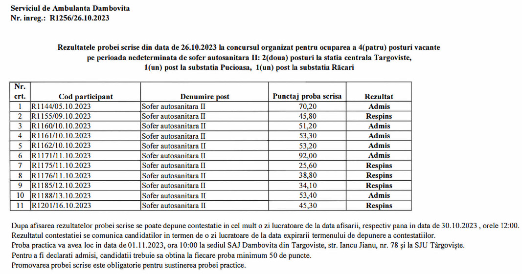 Un nou scandal pare să zguduie din temelii Serviciul Județean de Ambulanță Dâmbovița. Este vorba despre o suspiciune de fraudă la proba scrisă pentru un concurs care vizează ocuparea a patru posturi de șoferi. În data de 26 octombrie 2023, a avut loc un concurs pentru ocuparea a patru posturi vacante pe perioadă nedeterminată de șofer autosanitară II, distribuite astfel: 2 posturi la Stația Centrală Târgoviște, 1 post la substanția Pucioasa și 1 post la substanția Răcari. După procesul de selecție, au fost admise 11 dosare. Astfel, la proba scrisă s-au prezentat 11 candidați, iar conform datelor oficiale făcute publice pe site-ul oficial al Serviciului Județean de Ambulanță Dâmbovița, după susținerea examenului scris, au fost admiși 6 concurenți cu medii cuprinse între 51,20 și 92 de puncte. Cele 92 de puncte au fost obținute de un singur candidat.
