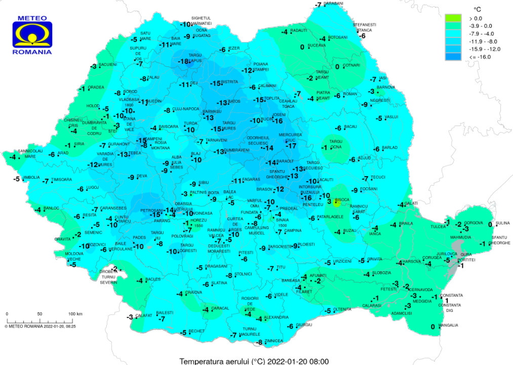 Temperaturile minime se vor situa între -11 şi -1 grad Celsius, cu valori mai scăzute în depresiunile intramontane. În zonele de vest şi centru se va lăsa ceață, pe alocuri.
