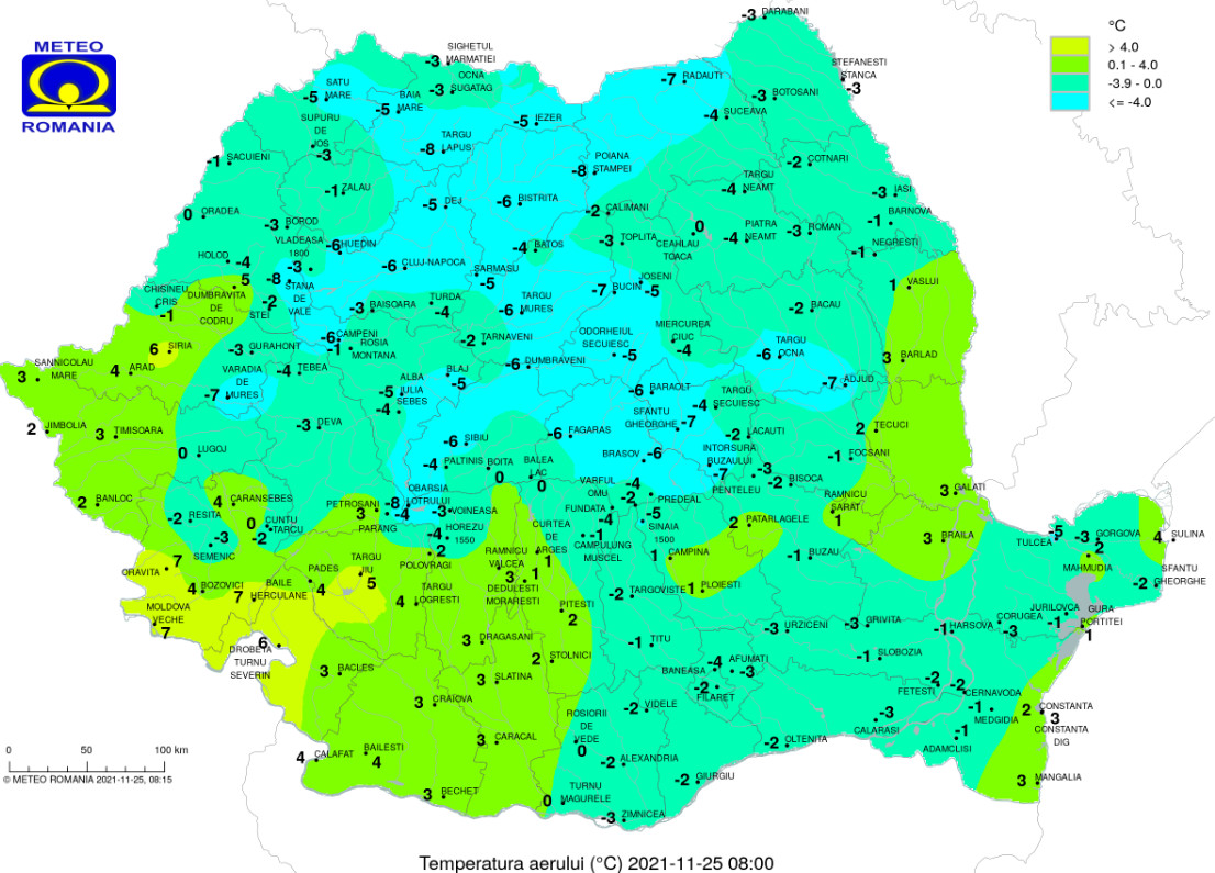 Temperaturile maxime se vor încadra între 3 şi 12 grade, iar cele minime între -9…-7 grade în depresiunile Carpaţilor Orientali şi în jurul a 6 grade în sudul Banatului şi pe litoral.