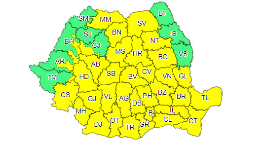 Notă: Manifestări de instabilitate atmosferică accentuată vor fi și în restul teritoriului, dar pe suprafețe mai mici și pe intervale mai scurte de timp.