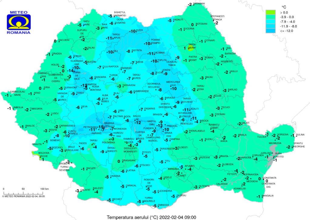 Temperaturile maxime se vor încadra între –1…0 grade in depresiunile din estul Transilvaniei şi 8…9 grade in sud-vest. Vântul va sufla slab şi moderat. Dimineaţa în zonele joase, pe spaţii restrânse se va forma ceaţă.