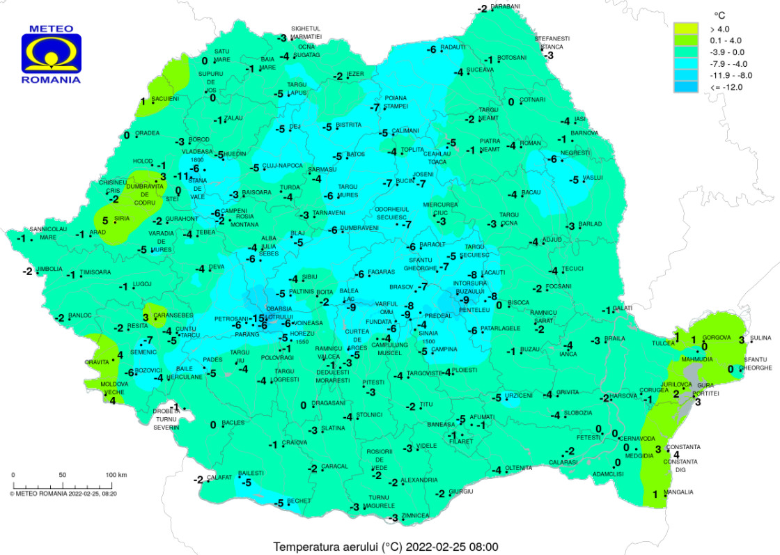 Vântul va sufla slab și moderat, cu unele intensificări pe crestele montane. Temperaturile maxime vor fi între 4 și 13 grade, iar temperaturile minime vor fi între -5 și 5 grade. Izolat se va forma ceață.