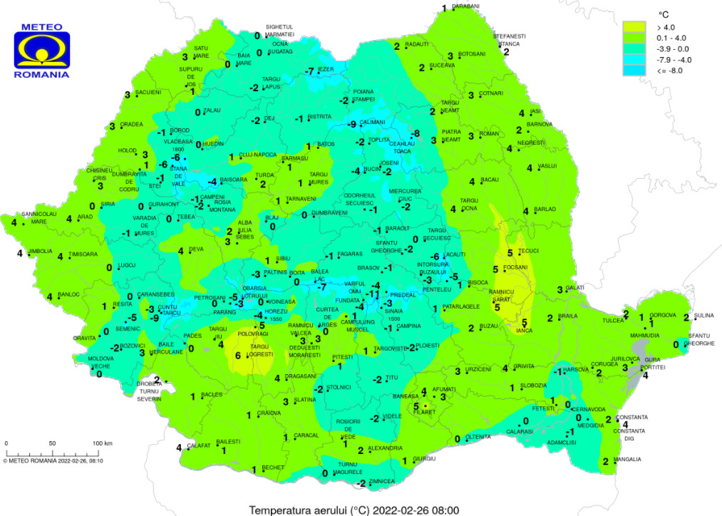 Temperaturile maxime ale zilei se vor situa între 4 și 12 grade Celsius, iar cele minime între -2 și 4 grade Celsius. Cele mai scăzute temperaturi vor fi înregistrate în Transilvania, unde mercurul din termometre va scădea sub -6 grade Celsius.